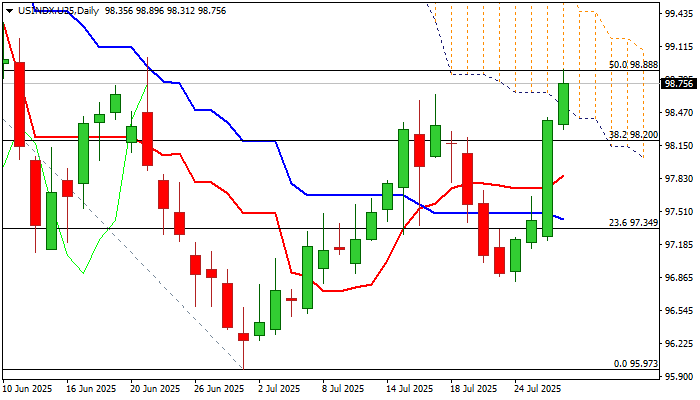Fresh gains broke above previous recovery high at $98.65, with close above this level to complete bullish failure swing pattern on daily chart and add to positive signals.