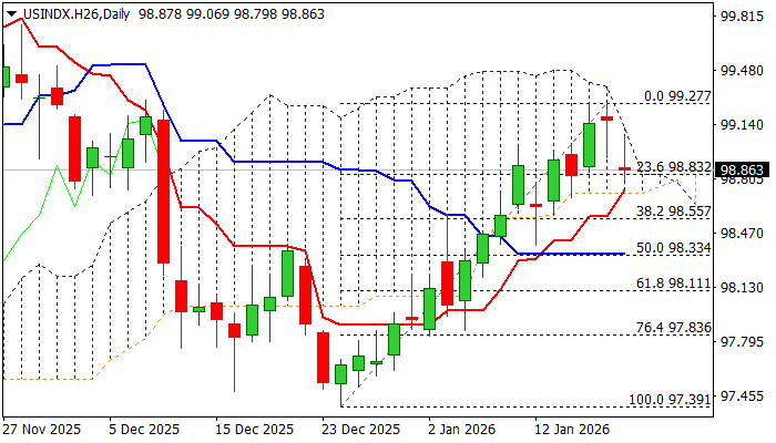 Fading bullish momentum and south heading RSI and Stochastic on daily chart (after Stochastics’ bearish divergence signaled stall of the latest rally) contribute to signals of further easing, along with double bull-trap (at $99.20 Fibo resistance) though fresh weakness needs to clear pivotal supports at $98.83/73 zone (Fibo 23.6% of $97.39/$99.27 / daily Tenkan-sen / cloud base) to validate signal and spark fresh acceleration lower (Fibo supports 38.2%; 50% and 61.8% at $98.55; $98.33 and $98.11 respectively).