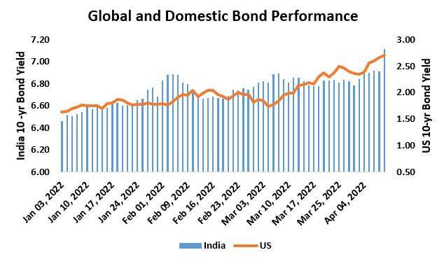 \Weaker global cues led to some weakness in the domestic market during the week, as investor sentiment turned cautious after a more hawkish tone by the US Federal Reserve. Domestic Bond markets sold off post RBI policy. The bond yields rose about 10-20 basis points across the curve. The sell-off was most intense in the 5 yr-15 yr segment of the curve where the supply is extremely heavy. Apart from the hawkish shift by the RBI, what spooked the bond markets more was that the RBI did not give any roadmap on how it intended to ensure that the massive government borrowing goes through in a non-disruptive manner. The India 10-Year Bond Yield closed the last session of the week, on its multiple months high of 7.119%.