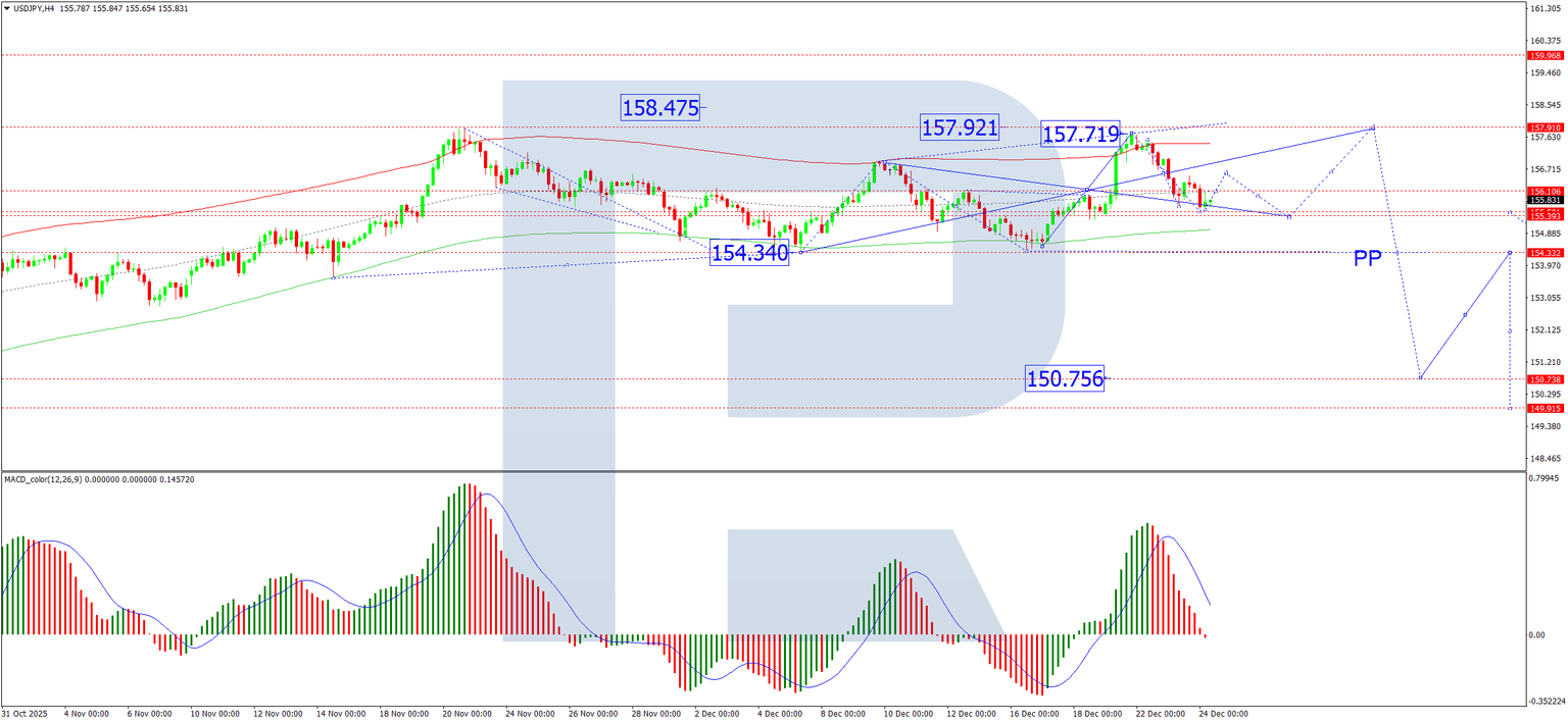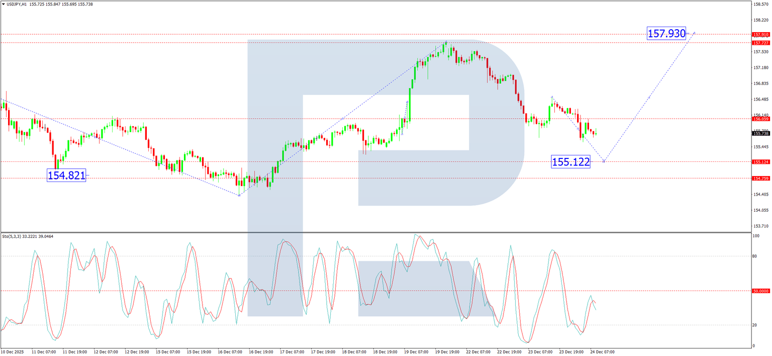 On the H1 chart, the pair is trading within a consolidation range around 156.06. A downside break would target a decline towards 155.12, whereas an upside resolution could initiate a move towards 157.92.