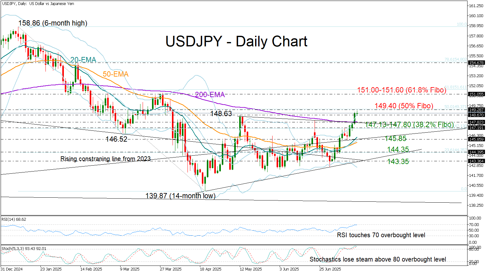 USD/JPY advanced above its 200-day exponential moving average (EMA) for the first time since February on Tuesday, while slightly extending its ascent to a new three-month high of 149.17 earlier today before losing momentum.