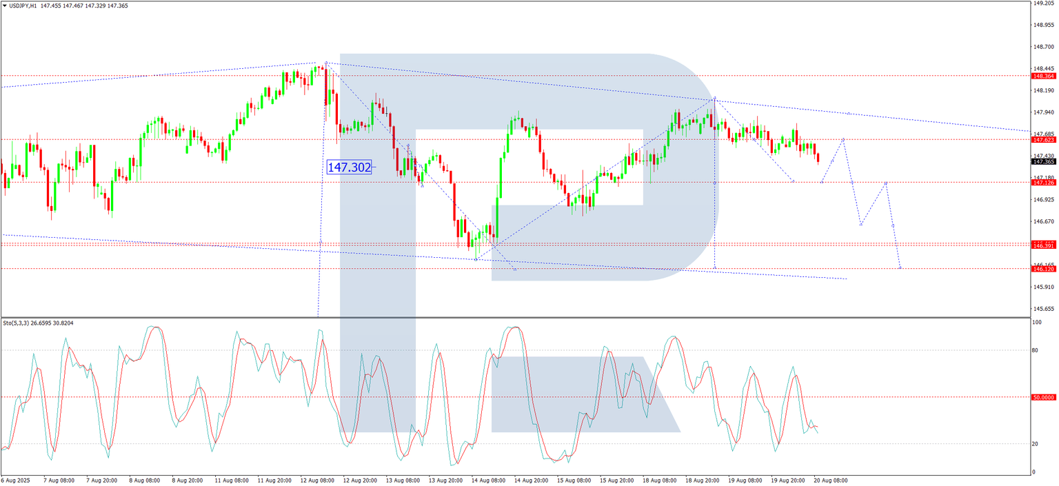 On the H1 chart, the market is shaping a downward wave structure towards 146.12. Today, we are considering a short-term move to 147.12, followed by a potential growth link to 147.60. After that, the market is likely to decline again to 146.60, and further to 146.12, continuing the bearish trend. The Stochastic oscillator confirms this view, with its signal line below the 50 level, directed sharply towards 20, reflecting a strong bearish bias.