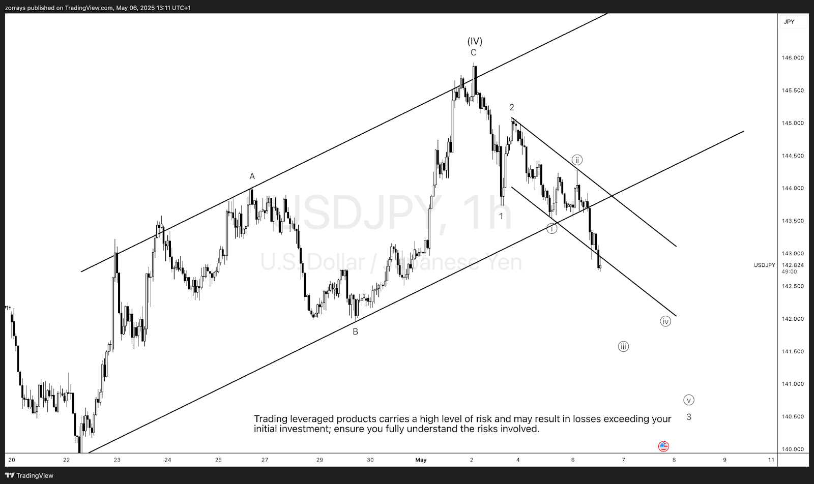 USDJPY has shifted gears from a corrective phase into a fresh impulsive decline. After completing a textbook zigzag in Wave (IV), the pair has resumed its broader downtrend, and the Elliott Wave structure now shows a clear bearish setup. With price action unfolding into a strong third wave decline, the path of least resistance appears lower—provided resistance at 144.300 holds firm.