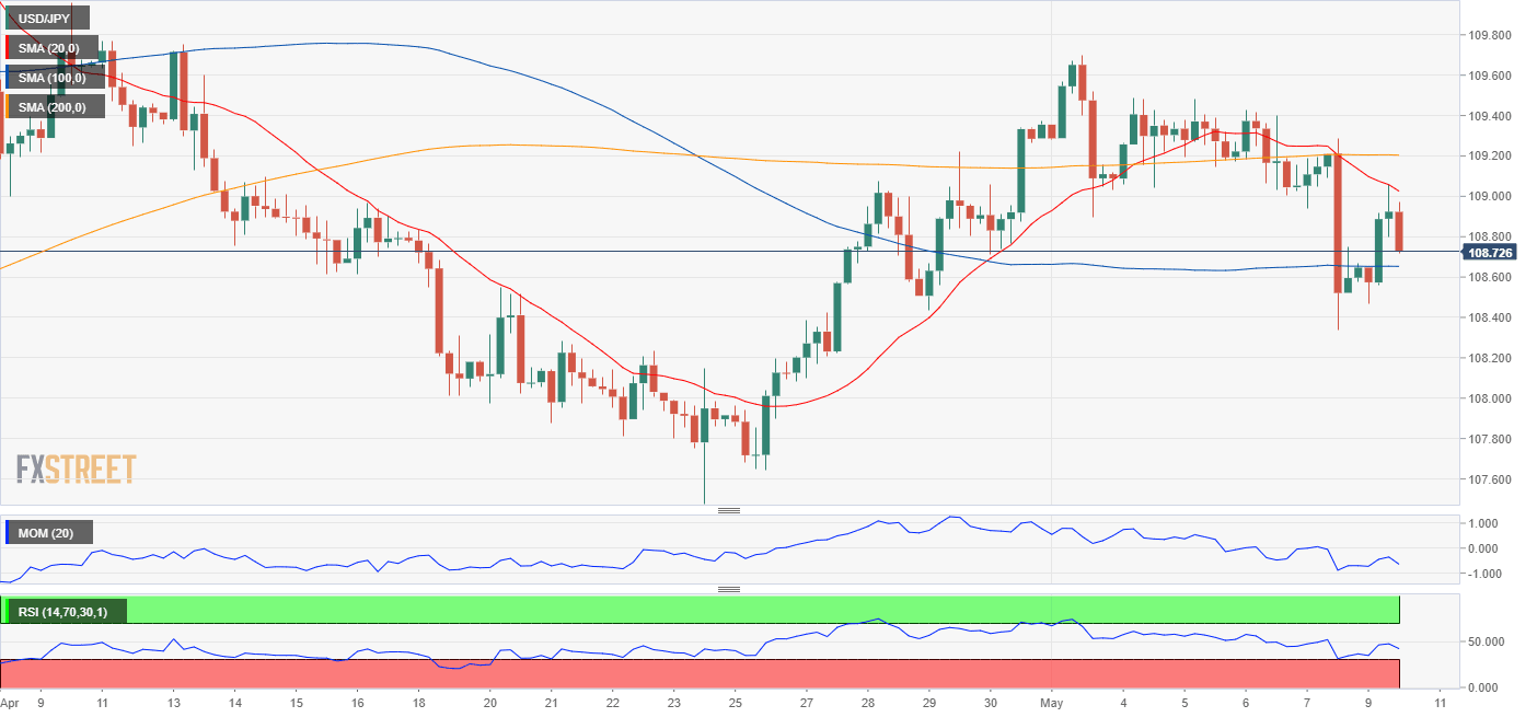 The USD/JPY pair is at risk of falling further. The 4-hour chart shows that the pair met sellers around a bearish 20 SMA, which extends its decline below the 200 SMA. A flat 100 SMA provides support at 108.65. Technical indicators have turned south within negative levels, indicating persistent selling interest.