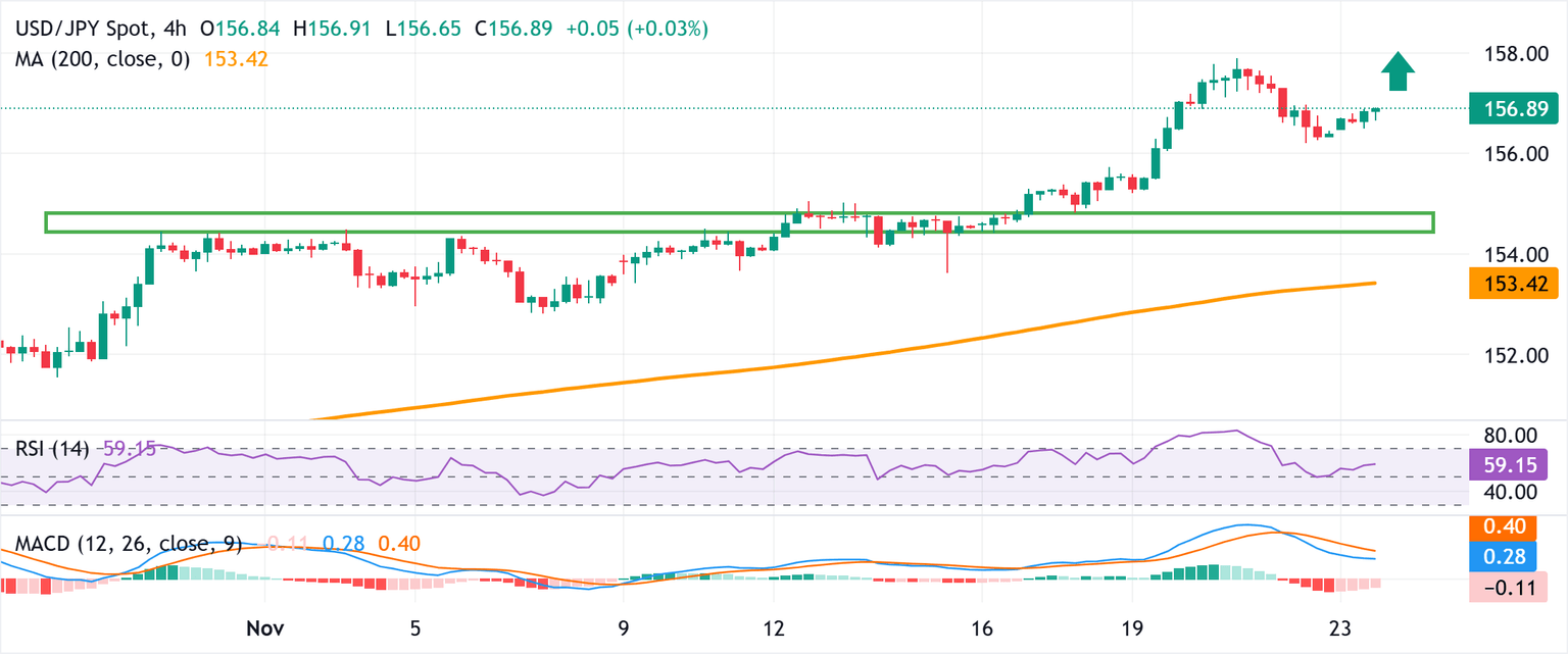 Meanwhile, BoJ Governor Kazuo Ueda told the parliament on Friday that a weak JPY could push up import costs and broader prices. Moreover, Japan's Statistics Bureau reported that inflation remains sticky above the BoJ's 2% target, keeping alive hopes for a near-term interest rate hike. In fact, a Reuters poll showed that a slim majority of economists expect the BoJ to raise rates to 0.75% in December. Adding to this, speculations that Japanese authorities would step in to stem any further JPY weakness might hold back the USD/JPY bulls from placing fresh bets.