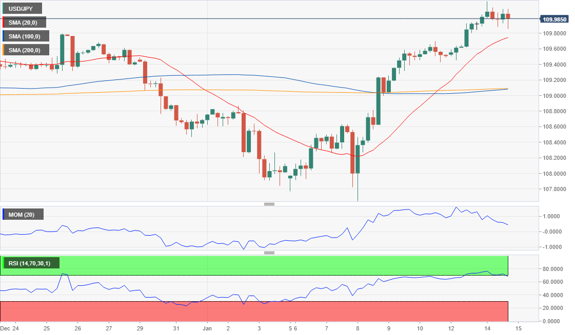 The USD/JPY pair is losing upward momentum, but far from turning bearish, as it holds a handful of pips below the mentioned multi-month high. In the 4-hour chart, the 20 SMA maintains its bullish slope well above the larger ones and below the current level, providing dynamic support at around 109.70. Technical indicators are easing, the Momentum nearing its mid-line, while the RSI is barely correcting extreme overbought conditions.