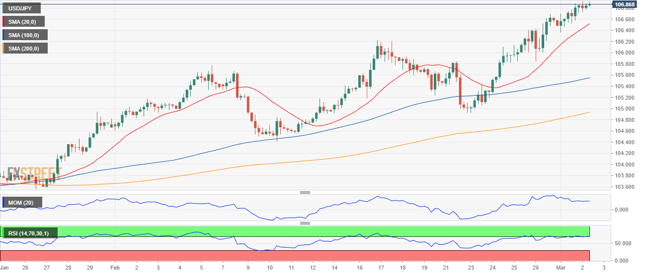 The USD/JPY pair trades in the 106.80 area, and it’s neutral-to-bullish in the near-term. In the 4-hour chart, the RSI indicator remains flat around 65, while the Momentum remains well above its midline, directionless. The 20 SMA advances above the larger ones, providing dynamic support around 106.50. Another leg higher seems likely on a clear break above 106.95, the immediate resistance level.
