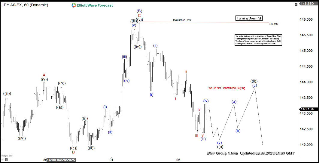 Wave (C) is currently developing as an impulse pattern in Elliott Wave terms. From the May 2, 2025 high, the price dropped to 143.72 (wave (i)), then rallied to 145.08 (wave (ii)). The decline resumed, reaching 142.34 (wave (iii)). A corrective rally in wave (iv) is believed to have finished at 143.30. The pair is now expected to decline further to complete wave (v). This will finalize wave ((i)) in the larger structure. After this, a corrective rally in wave ((ii)) should occur, partially recovering from the May 2, 2025 high, before the downward trend resumes.
