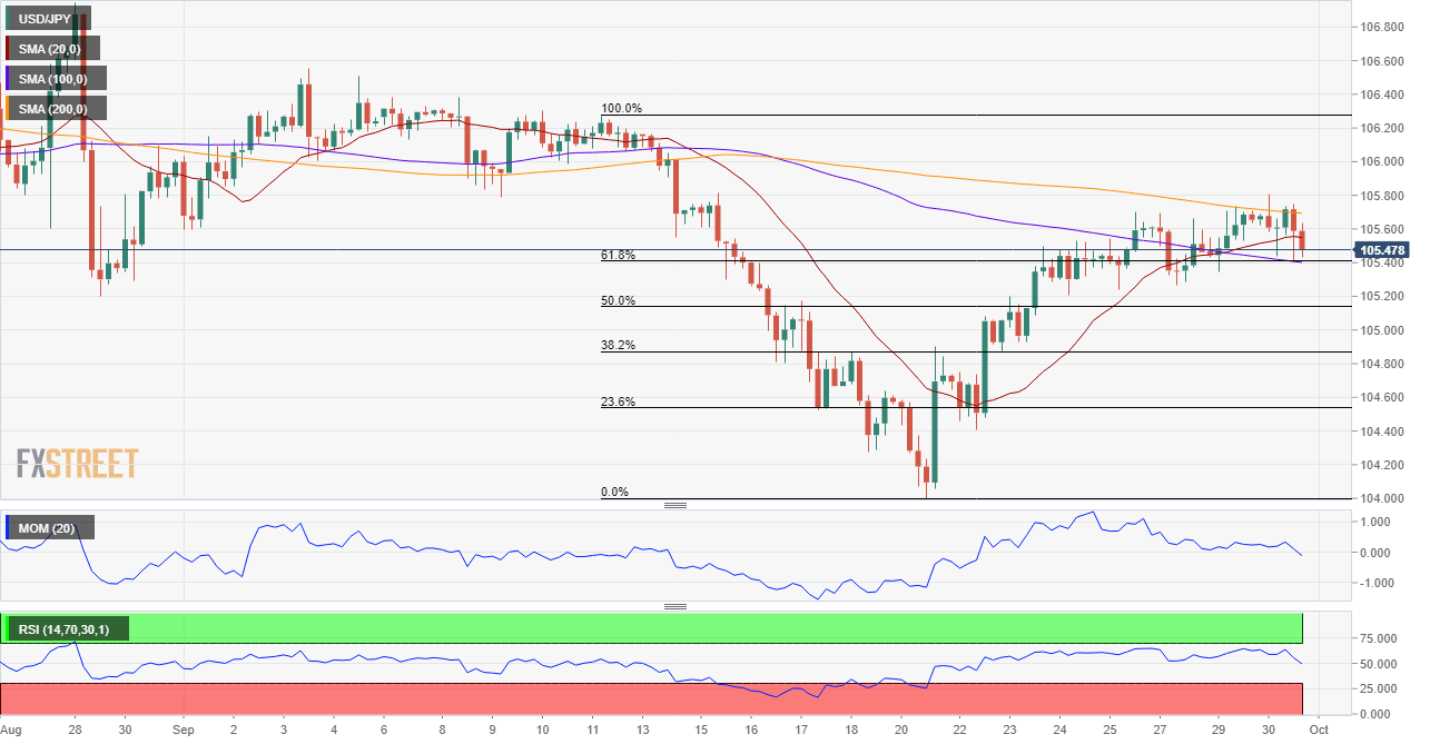 The USD/JPY pair continues to trade above the 61.8% retracement of its latest daily decline at 105.40, the immediate support level. The upside potential is limited, as the 4-hour chart shows that sellers have kept rejecting advances around the 200 SMA, which stands at 105.80. Technical indicators have turned south and are about to enter negative territory. The bearish case will probably pick up momentum on a break below the mentioned Fibonacci support level.