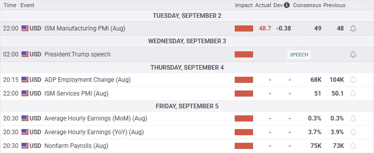 ISM Manufacturing PMI (Aug) printed 48.7, a touch below 49.0 forecast - but above the previous 48.0. Markets read that as stabilization rather than deterioration, and the USD caught a bid despite the “contractionary” label. This is a good reminder that direction of change often beats the absolute level.