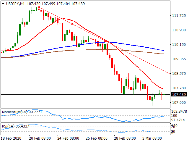 The USD/JPY pair managed to recover some ground on Wednesday following a selloff triggered by the Fed decision to cut rates by 50 bps in a preemptive move to offset coronavirus’ adverse effects on the economy. Persistent concerns around the coronavirus outbreak have kept investors’ sentiment depressed, favoring the rally of the yen over the last weeks. The USD/JPY reversed sharply from a 10-month high of 112.22 struck on February 20 and dropped more than 500 pips to a five-month low of 106.84 after Fed’s move. However, upbeat economic data, ISM non-manufacturing PMI and ADP jobs, coupled with a bounce in US yields and oversold conditions, helped the dollar to recover some ground to end around 107.40.