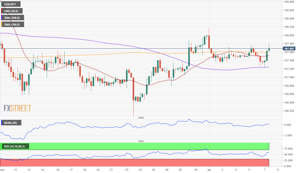 The USD/JPY pair is trading near a daily high of 107.78, neutral in the short-term, although with the risk skewing to the upside. However, in a risk-averse environment, the chances of a bullish run are limited. In the 4-hour chart, the pair is trading above all of its moving averages, which remain flat, as technical indicators are directionless just above their midlines. The pair has an immediate Fibonacci resistance at 107.95, the level to surpass to see it gather additional bullish momentum.