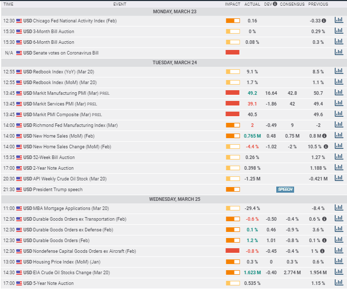 A powerful equity rally that started on Tuesday in anticipation the Congressional rescue package had restored 21.3% to the Dow by the close on Thursday raising the 30 stock index from 18,591 at Monday’s finish to 22,252 three days later. Friday’s 800 point drop in the average did not return risk-off sentiment to the dollar yen which finished at 108.03.