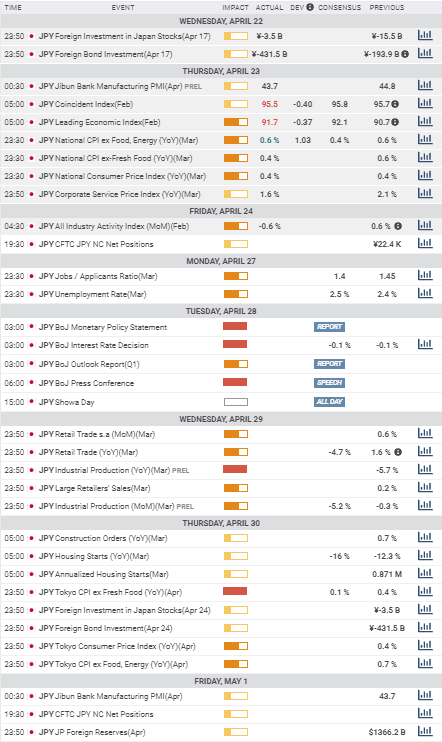Japanese economic statistics were generally weaker than forecast but not greatly so and except for the March numbers for the Jibun manufacturing PMI and imports and exports listed February information.
