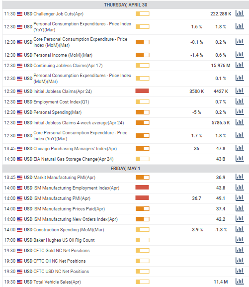 In the week ahead initial and continuing claims remain center stage. The forecast 50% decline will not be taken as good news given that it will bring the six week unemployment total to nearly 30 million. Likewise manufacturing PMI even if worse than predicted will have small import, though a better than expected number should be mildly positive for equities.