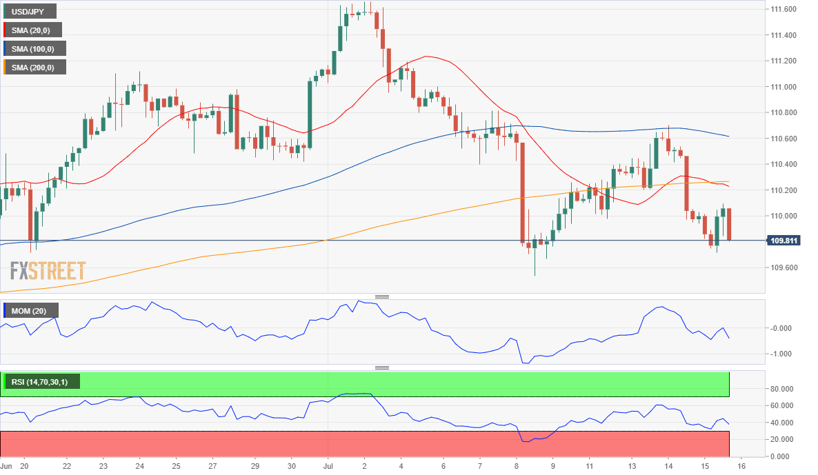 The USD/JPY pair maintains the near-term bearish stance, heading into the Asian opening trading in the 109.80 price zone. The 4-hour chart shows that it spent the day below all of its moving averages, although the 20 and 200 SMAs converge directionless at around 110.20. Technical indicators resumed their declines within negative levels, with the Momentum already at fresh lows, supporting a bearish continuation.