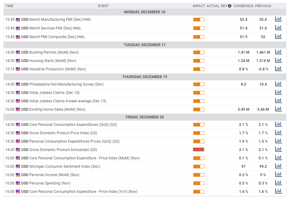 The economic calendar is packed with indicators in the last full week of the year. Markit's preliminary Purchasing Managers' Indexes stand out early in the week. Contrary to the ISM PMIs, Markit's figures have shown that both the manufacturing and services sectors are growing at a slow pace.