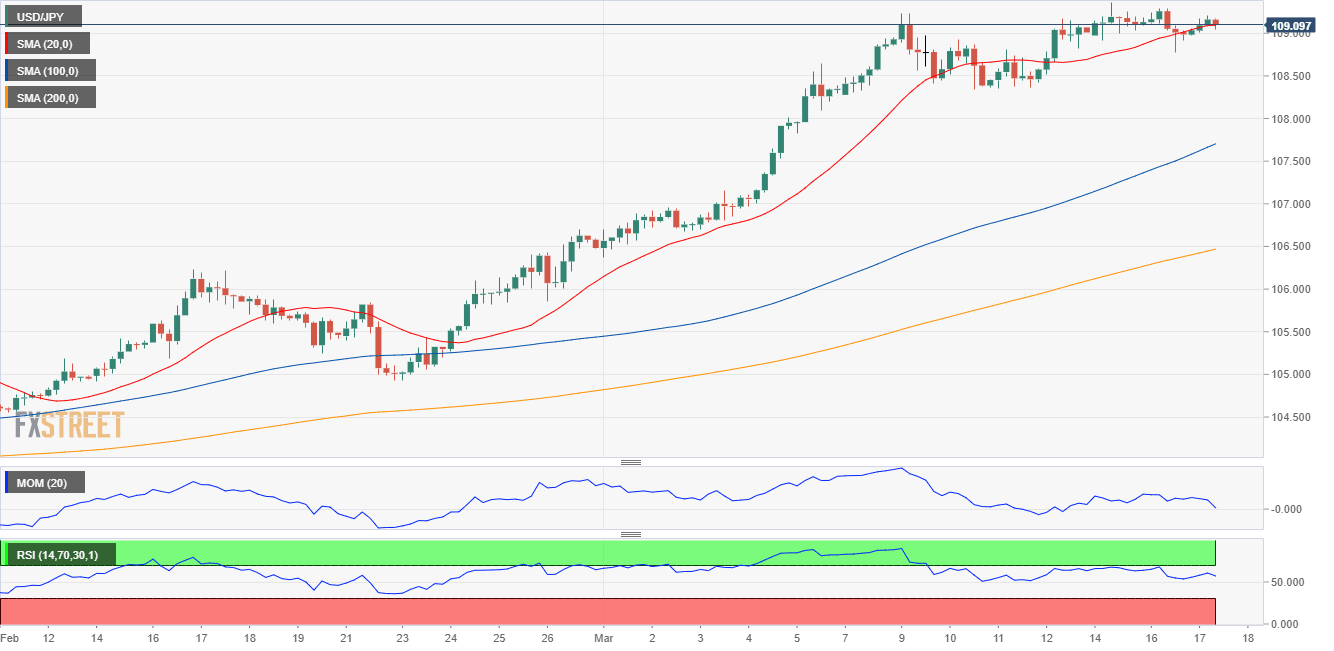 The USD/JPY pair trades just above the 109.00 figure, losing its bullish potential. In the 4-hour chart, the price is hovering around a mildly bullish 20 SMA, while technical indicators turned south, with the Momentum in neutral territory and the RSI around 55. A steeper decline could take place if the pair breaks below 108.80, although it all depends on the Fed and how government bond yields react afterwards.