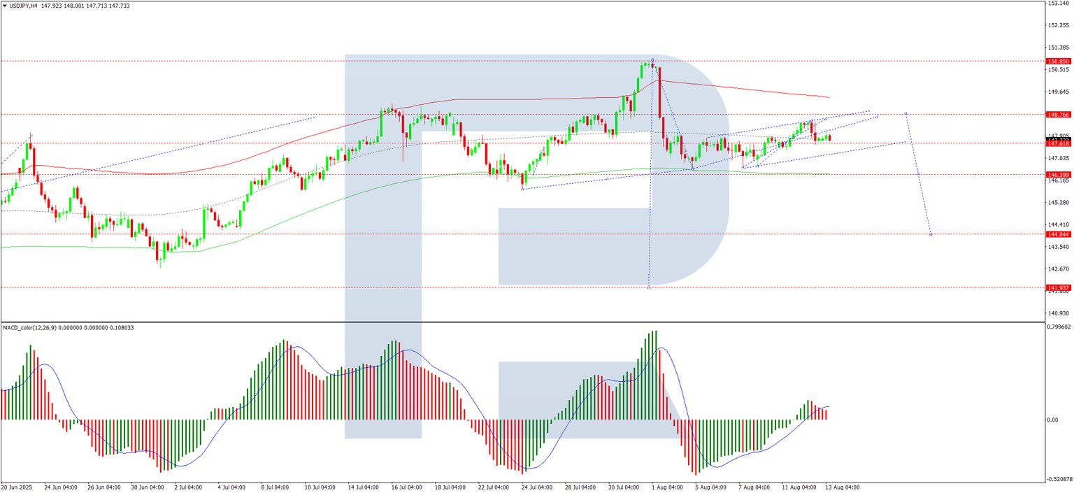 The USD/JPY pair continues its corrective wave towards 148.60. A pullback to 147.52 is expected today, after which another upswing to 148.60 may materialise. Once this wave exhausts, a decline towards 146.40 is anticipated. This scenario is technically validated by the MACD indicator, with its signal line above zero and trending upwards.
