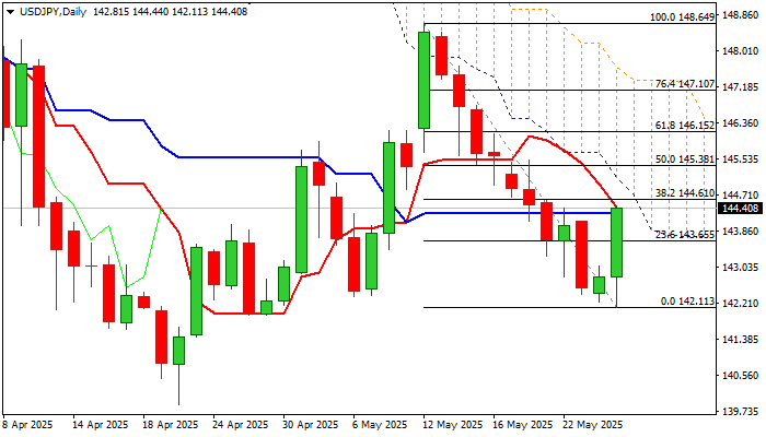 Fresh bulls pressure strong barriers at 144.61/70 (Fibo 38.2% of 148.64/142.11 / base of falling thick 4-hr cloud) break of which to validate positive signal and open way for further advance towards 145.10 (descending daily cloud base) and 145.38 (50% retracement).