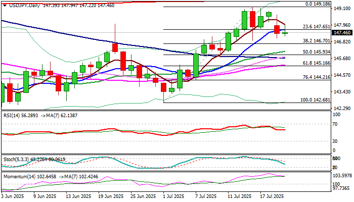 Repeated daily close below 147.65 (broken 10DMA / Fibo 23.6%) to keep the downside vulnerable, though overall bullish structure on daily chart, works in favor of scenario of limited correction before fresh push higher.