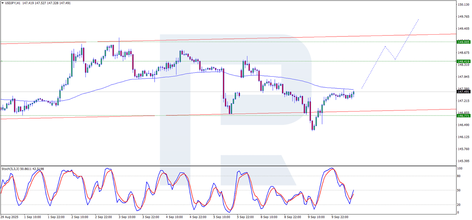 On the H1 chart, the pair is testing the 147.50 JPY resistance level. A break above this level could open the way for further gains towards 148.40 JPY. The Stochastic oscillator aligns with this view, as its signal lines are rising towards the 50.0 level. A clear break above 50.0 would signal strengthening upward momentum.
