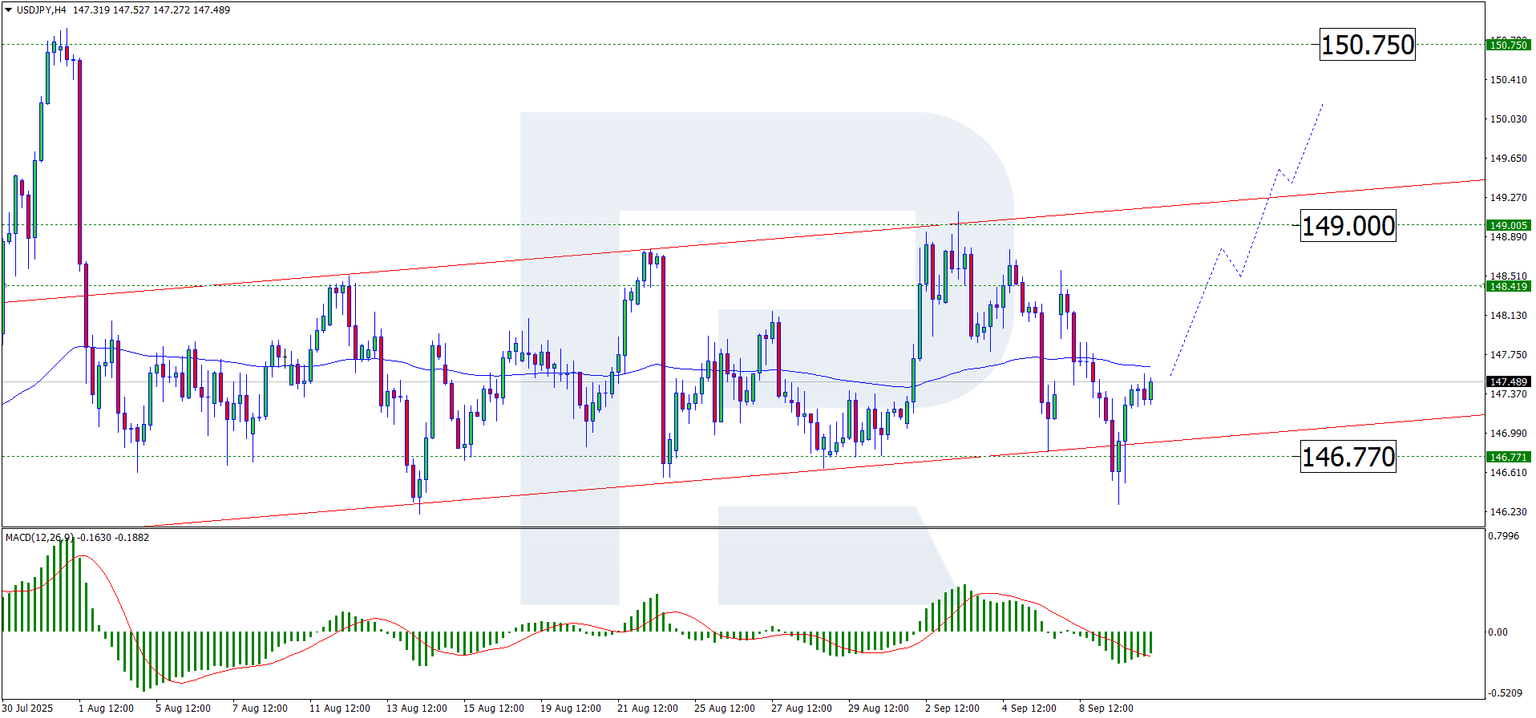 On the H4 chart, USD/JPY continues to develop an upward wave within an ascending channel. The next likely target is the upper channel boundary near 148.40 JPY. Following this ascent, the pair may enter a corrective phase. The primary upside targets remain 149.00 JPY, with a further objective at 150.75 JPY. The MACD indicator supports this outlook: the histogram remains below zero but has begun to rise, while the signal line has moved above the histogram and is turning upward, signalling building bullish momentum.