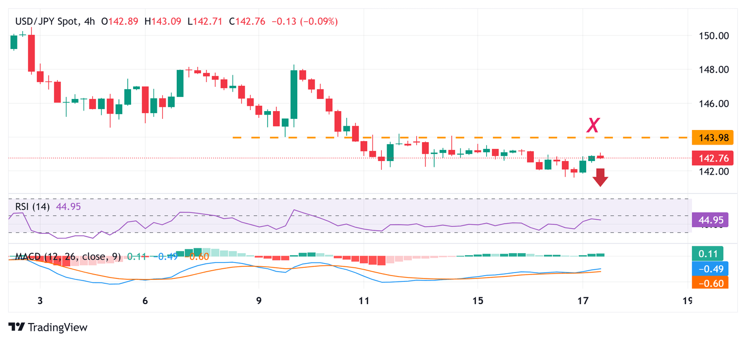 From a technical perspective, the overnight breakdown and close below the 142.00 mark was seen as a fresh trigger for bearish traders. Moreover, oscillators on the daily chart are holding deep in negative territory, suggesting that the path of least resistance for the USD/JPY pair is to the downside. Hence, any subsequent move up beyond the 143.00 round figure could be seen as a selling opportunity near the 143.55-143.60 region. This might cap spot prices near the 144.00 pivotal barrier, which if cleared might trigger a short-covering rally to the 144.45-144.50 horizontal barrier en route to the 145.00 psychological mark.