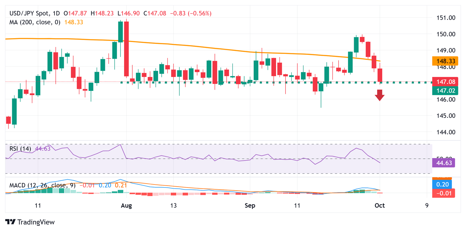 From a technical perspective, the USD/JPY pair's intraday uptick early this Wednesday faltered ahead of the 200-day Simple Moving Average (SMA), and the subsequent downfall validates the negative outlook. Moreover, oscillators on the daily chart have again started gaining negative traction. Some follow-through selling and acceptance below the 147.00 mark will set the stage for a fall towards the 146.30-146.25 support. This is closely followed by the 146.00 round figure, below which spot prices could aim to retest the September monthly swing low, around the 145.50-145.45 region, before eventually dropping to the 145.00 psychological mark.