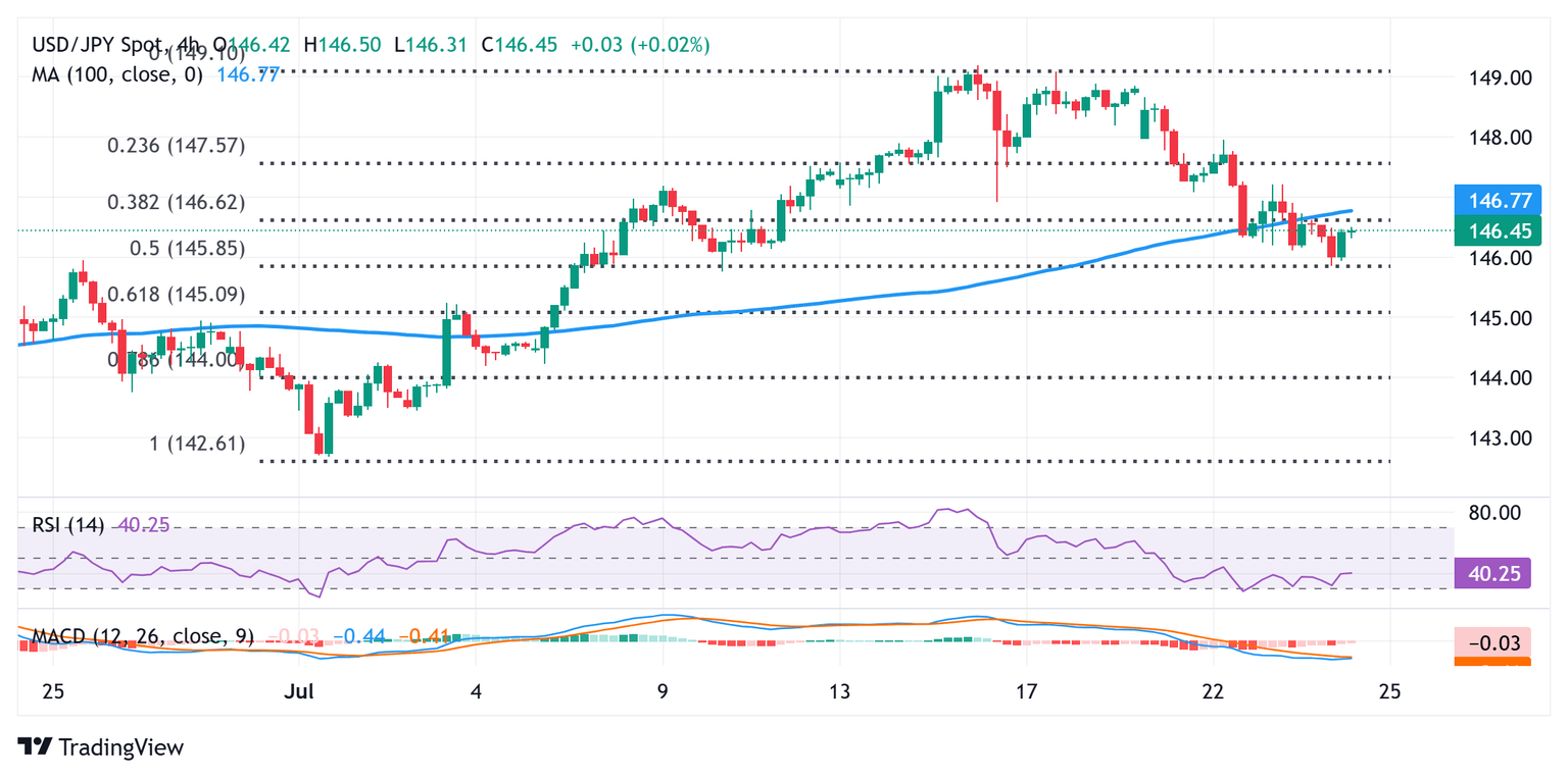 The USD/JPY pair stages a goodish intraday recovery of over 50 pips from a two-week low touched earlier this Thursday and moves back closer to mid-146.00s during the first half of the European session. The prevalent risk-on environment, bolstered by the latest trade optimism, is seen undermining demand for traditional safe-haven assets, including the Japanese Yen (JPY). Reports suggest that the US and the European Union (EU) are heading towards a 15% tariff deal, which provides an additional boost to the global risk sentiment against the backdrop of the recently announced Japan-US trade agreement. Apart from this, the domestic political uncertainty and the disappointing data from Japan weigh on the JPY, which, along with a modest US Dollar (USD) recovery, prompts some intraday short-covering around the currency pair.
