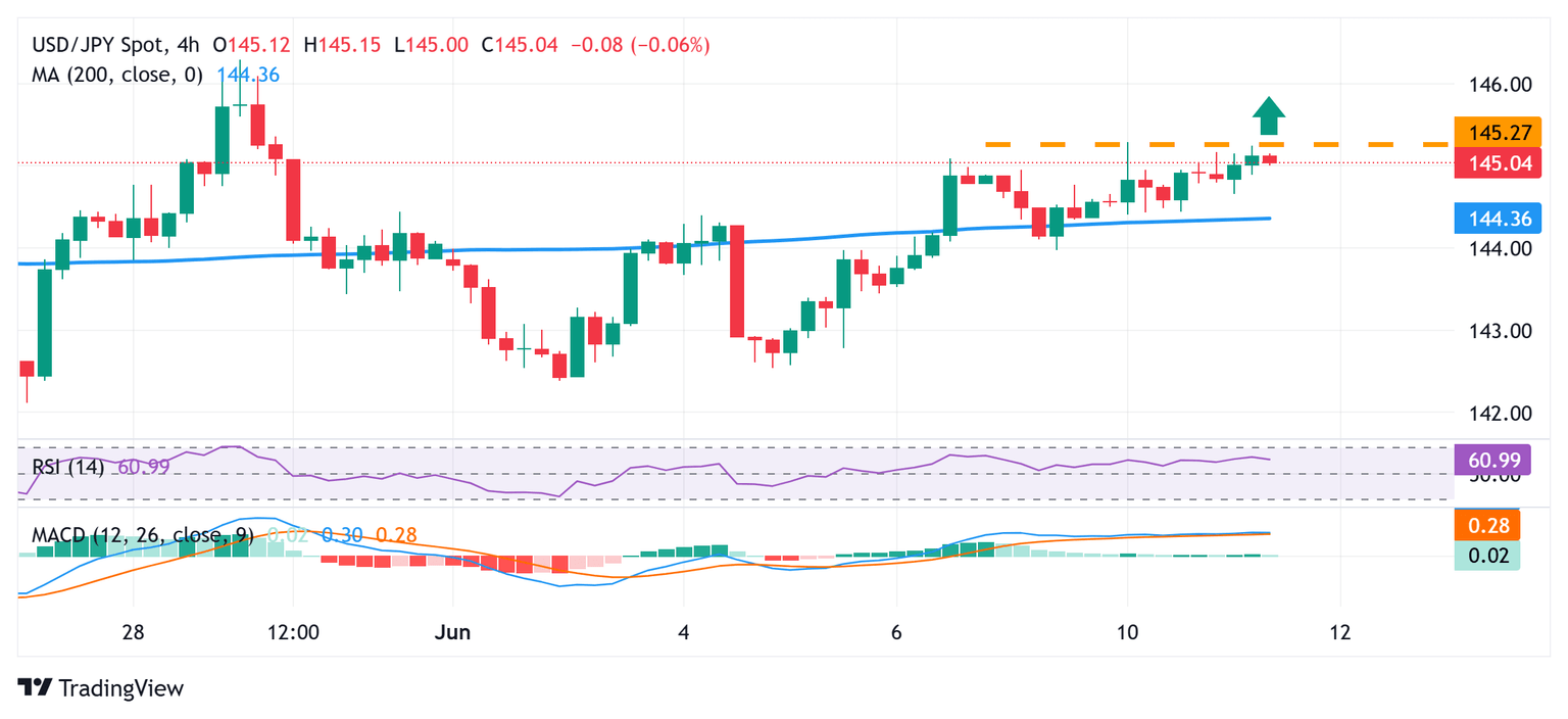 The USD/JPY pair attracts buyers for the second straight day on Wednesday and trades near the 145.20 area, close to a two-week top during the early part of the European session. The Japanese Yen (JPY) weakened after data released earlier today showed that Japan's Corporate Goods Price Index (CGPI) rose 3.2% in May from a year earlier. This was the slowest increase since September last year and marked a notable deacceleration from a revised 4.1% gain in the previous month, which could ease pressure on the Bank of Japan (BoJ) to raise interest rates.