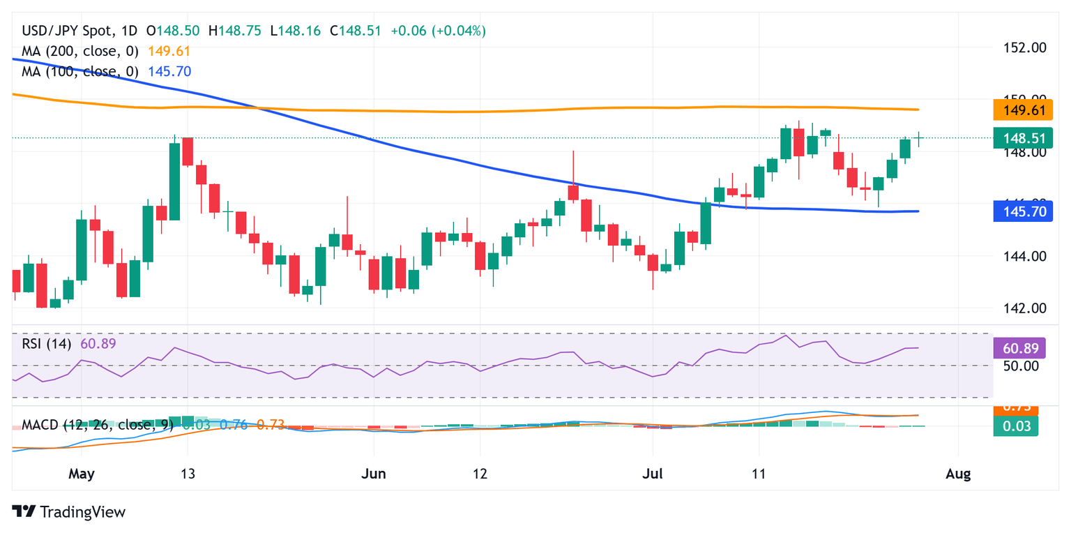 From a technical perspective, any subsequent move up is likely to confront a hurdle near the 149.00-149.10 region, or the monthly top. This is closely followed by the very important 200-day Simple Moving Average (SMA), around the 149.55 area, which, if cleared decisively, will be seen as a fresh trigger for the USD/JPY pair. The subsequent move up should allow spot prices to reclaim the 150.00 psychological mark and test the next relevant hurdle near the 150.45-150.50 zone.