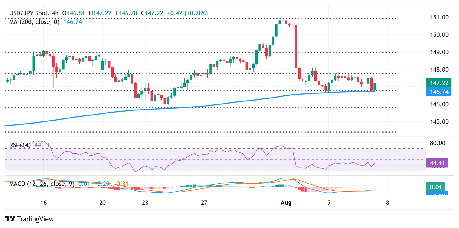 The bets were lifted by the weaker-than-expected US Nonfarm Payrolls (NFP) report released last Friday and Tuesday's disappointing US ISM Services PMI print. Moreover, the Fed is expected to deliver at least two 25-basis-point rate cuts by the end of this year. This keeps the USD bulls on the defensive and exerts additional downward pressure on the USD/JPY pair. However, the prevalent risk-on environment keeps a lid on the safe-haven JPY, which, in turn, assists spot prices to trim a part of intraday losses and climb back above the 147.00 mark in the last hour.