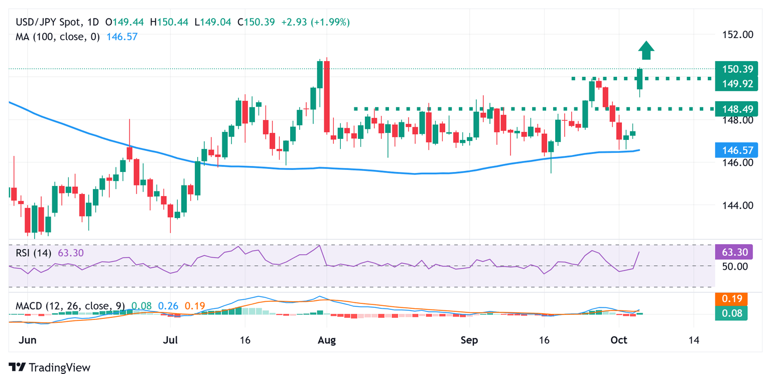 Against the backdrop of last week's bounce from the 100-day Simple Moving Average (SMA), intraday breakout and acceptance above the 150.00 round figure could be seen as a fresh trigger for the USD/JPY bulls. Moreover, oscillators on the daily chart are holding comfortably in positive territory and suggest that the path of least resistance for spot prices is to the upside. This, in turn, backs the case for a move towards testing the August swing high, around the 151.00 neighborhood, with some intermediate hurdle near the 150.65-150.70 region.