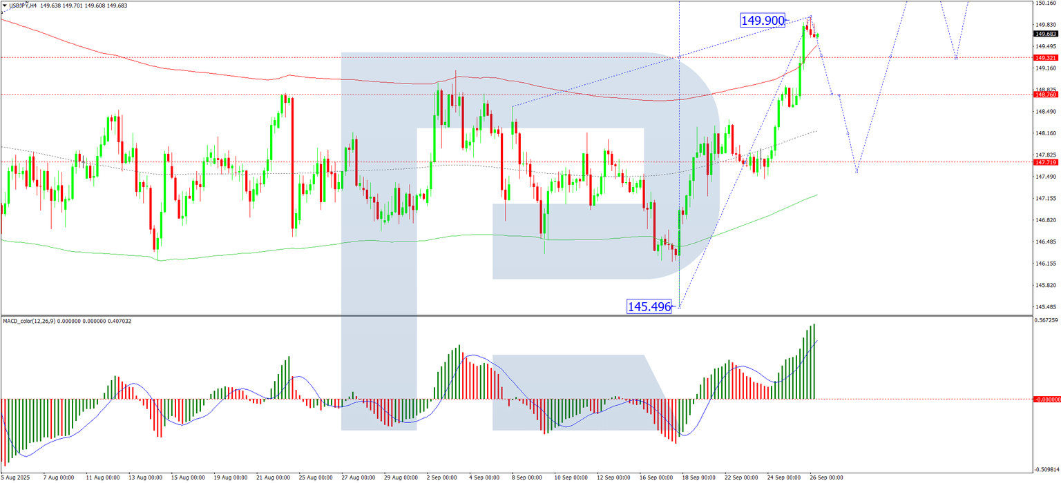 On the H4 chart, USD/JPY completed an initial advance to 149.90. The pair is now forming a consolidation range below this level. A downward breakout would likely initiate a correction towards 148.78, with a potential extension to 147.77 (testing the level from above). Once this correction concludes, a new upward move targeting 151.05 is expected to develop. This outlook is supported by the MACD indicator: its signal line remains well above zero, although a pullback towards the zero line is anticipated.