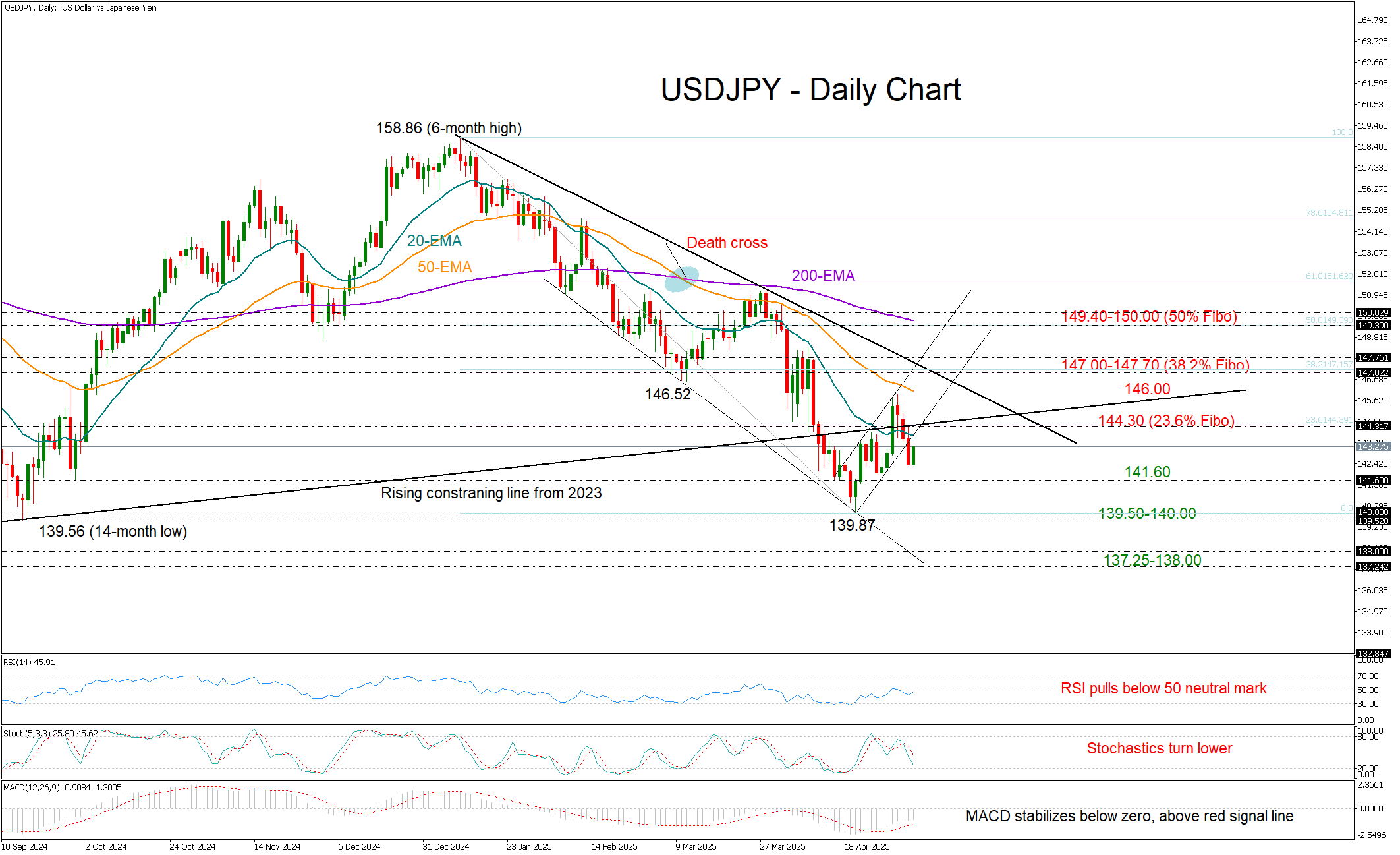Resistance at 144.23, support at 141.60.