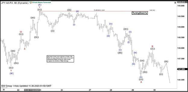 USD/JPY shows incomplete bearish sequence from 11.13.2023 suggesting further downside. Down from 11.13.2023 high, decline is unfolding as a double three Elliott Wave structure. Down from 11.13.2023 high, wave (W) ended at 147.15. Wave (X) ended at 149.78 with internal subdivision as a double three in lesser degree. Up from wave (W), wave W ended at 148.59 and dips in wave X ended at 148. Wave Y higher ended at 149.78 which completed wave (X).