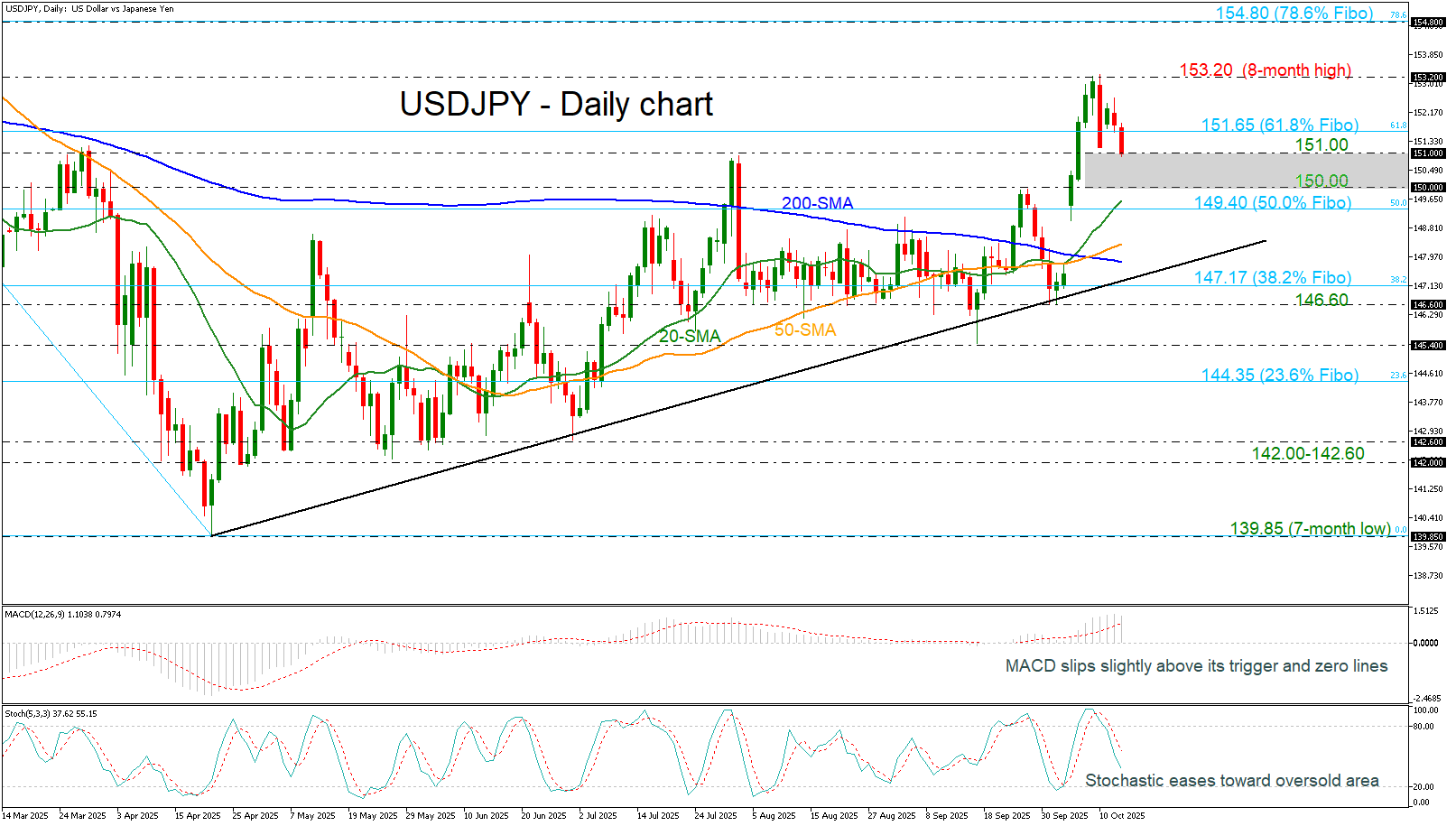 Technically, further downside pressure could expose the 150.00 psychological threshold, with the 50.0% Fibonacci retracement of the 158.86–139.85 decline located at 149.40. A break below this zone may accelerate bearish momentum toward the 50-day and 200-day simple moving averages (SMAs) at 148.35 and 147.80, respectively. The medium-term ascending trendline near 147.50 could act as a final buffer against deeper losses.