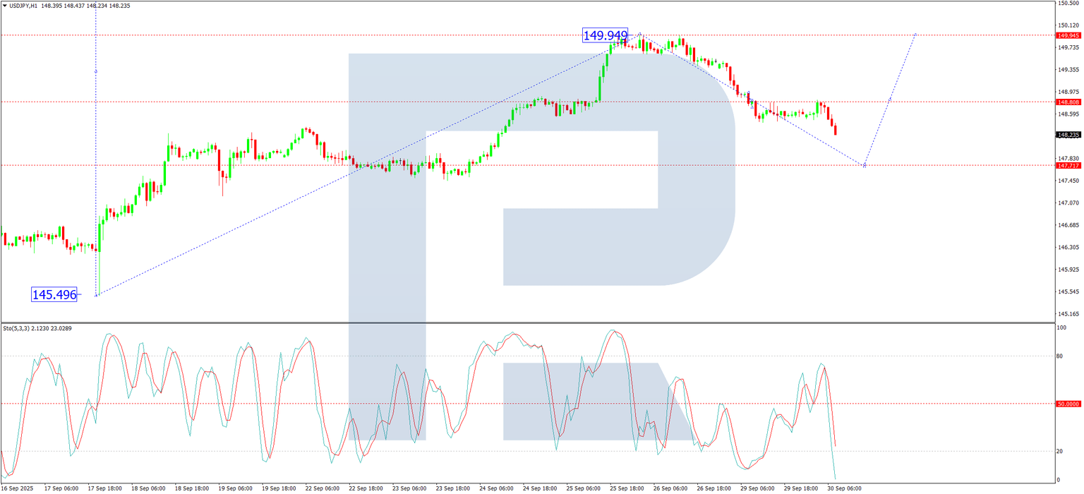 The H1 chart shows the pair completed a decline to 148.80 and consolidated around this level. The subsequent downside breakout has confirmed the continuation of the bearish wave structure towards 147.72. The Stochastic oscillator supports this view, with its signal line below 50 and falling sharply towards 20.