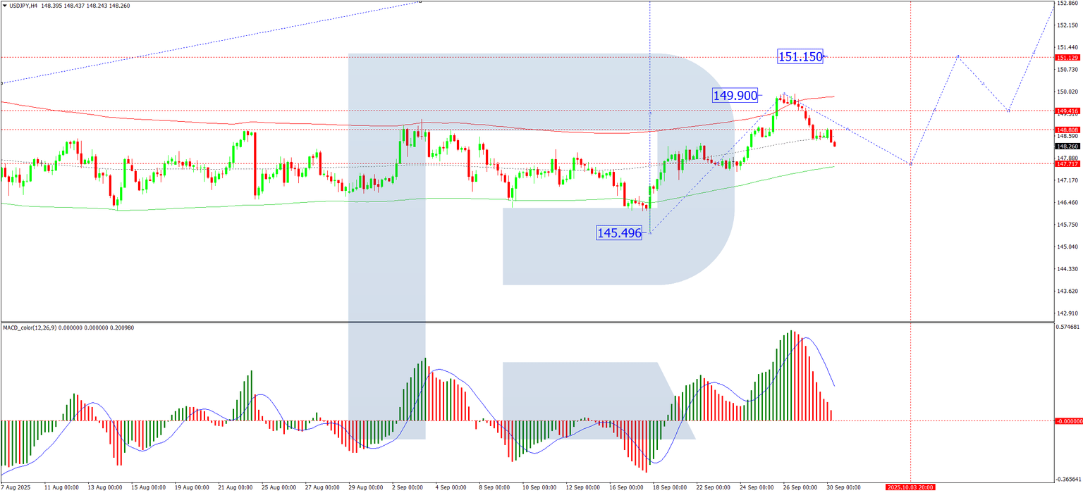 On the H4 chart, USD/JPY formed a tight consolidation range around 148.80. Today's downside breakout has extended the correction, with the next target at 147.72. Upon reaching this level, we anticipate a potential new growth wave towards 149.95. This scenario is technically confirmed by the MACD indicator, whose signal line is above zero but pointing firmly downward.