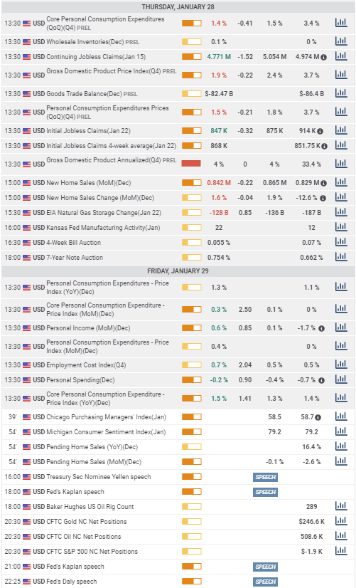 Initial Jobless Claims dropped to 847,000 in the January 22 week from 914,000 prior, 875,000 were expected. Continuation Claims fell to 4.771 million, the lowest of the pandemic, from 4.974 million, 5.054 million were forecast. US GDP in the fourth quarter expanded 4.0% as forecast. New Home Sales rose 1.6% to 842,000 annualized in December from 829,000.