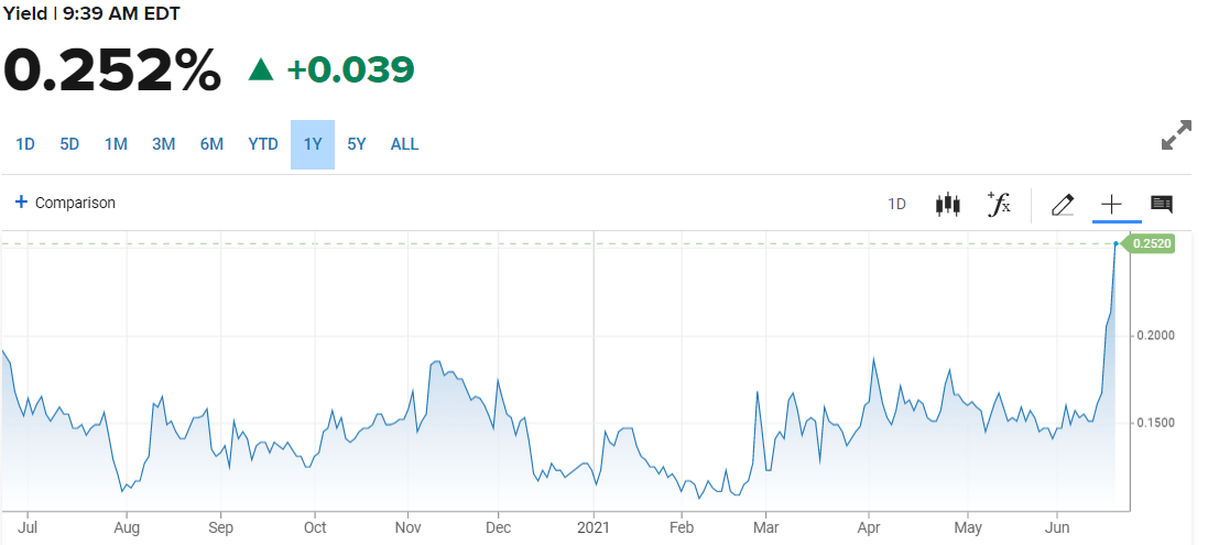 Despite the positive updates, Federal Reserve Chair Powell gave no indications when the bank might begin to reduce its bond purchases. This program has pinned the short end of the yield curve to near historic lows for more than a year.