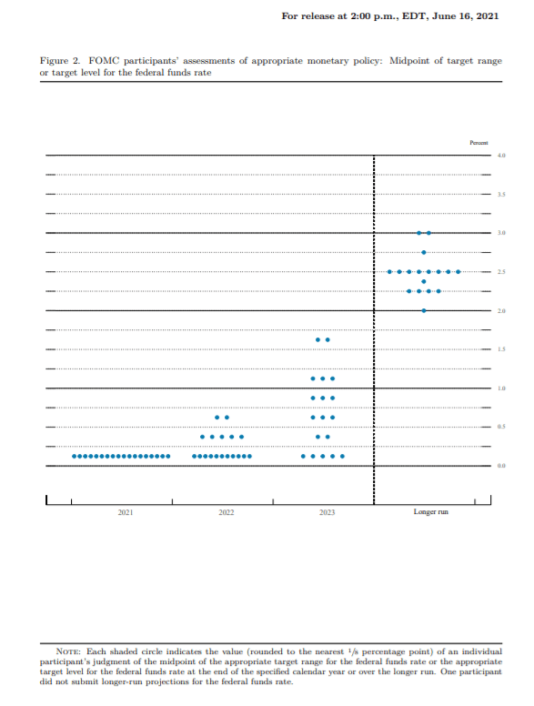 In a major change, the estimate for the fed funds rate at the end of 2023, which had been unaltered in March at 0.1%, moved to 0.6%. Federal Reserve rate increases, unless under emergency conditions, come in increments of 0.25%, implying two hikes that year.