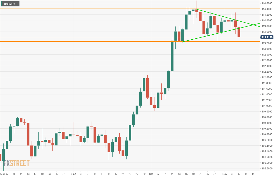 The rejection at 114.00 in four straight trading sessions and the pennant exit have tilted the technical future lower.