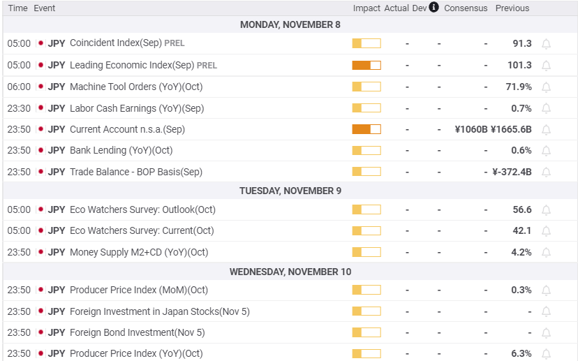Japanese data in the week ahead, September's Coincident Index or the Eco Watchers Survey for October, will not move the USD/JPY.