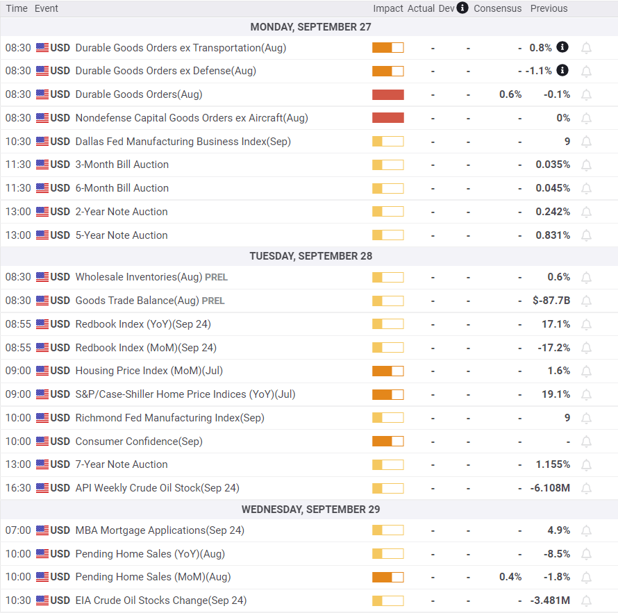 US data begins with Durable Goods Orders for August, essentially a restatement of the Retail Sales figures with the important exception of the Nondefense Capital Goods Orders, a much followed proxy for business investment. The manufacturing Purchasing Managers’ Index will shed insight on whether the factory sector is surmounting labor and material shortages and price inflation. A positive assessment will support the dollar.