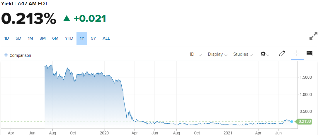 In contrast, the 2-year return has fallen just 8 basis points from its 0.27% high on June 25 to its 0.192% close on Thursday.