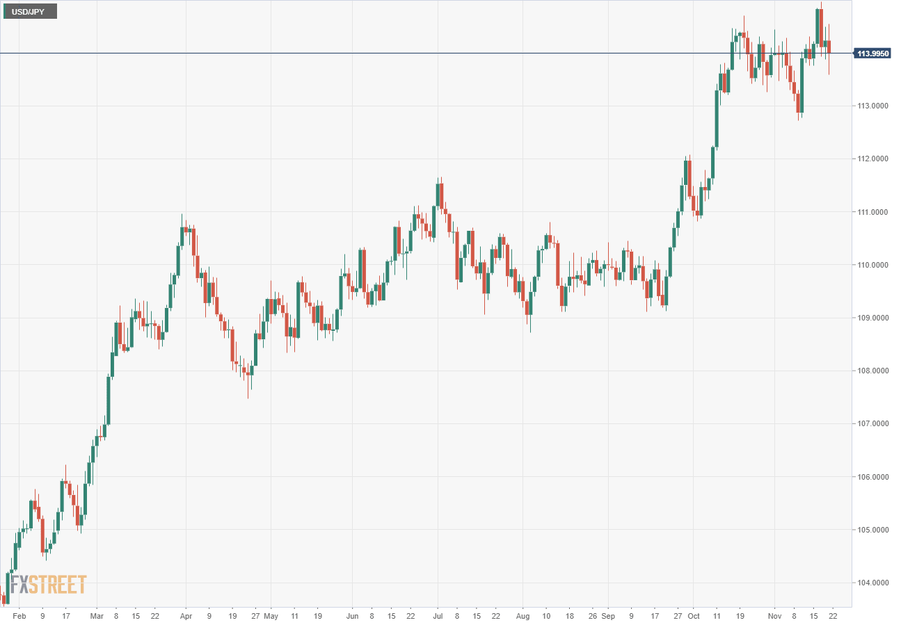 The USD/JPY closed at 114.83 on Tuesday and touched 114.97 on Wednesday, both the highest since March 2017, after a trio of strong US October economic reports. Retail Sales more than doubled to 1.7% from 0.8% in September. Industrial Production jumped to 1.6% from a 1.3% decline in September. Capacity Utilization climbed to 76.4%, its best level since February 2020, from 75.2% in September.