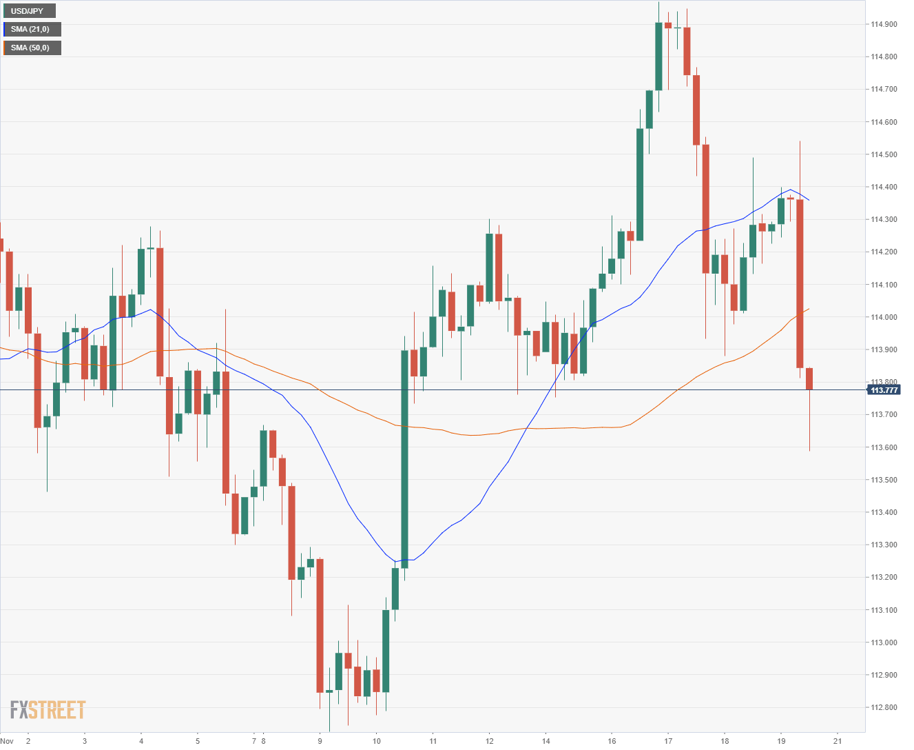 The reversal before 115.00 on Wednesday was facilitated by gathered sell-orders above the old high of 114.50 and was played out by the end of the New York session. Thursday’s consolidation confirmed the lack of a new motive. The drop on Friday through 114.00 was due to a combination of factors. Technically, the market top in the four-hour chart since Wednesday’s fall was marked by the 21-day moving average (MA), surging COVID cases in Europe and a new lockdown in Austria garnered a yen safety response and US Treasury rates fell on speculation that Fed Chair Jerome Powell might be replaced.