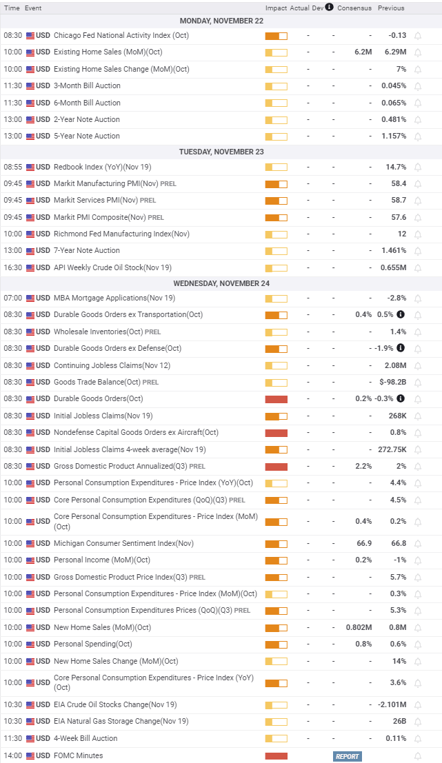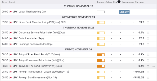 Japanese statistics provide a look at November CPI in Tokyo but there is no reason to expect any change in the the deflationary impulse. American information is heavily loaded on Wednesday before the Thanksgiving holiday on Thursday. Durable Goods Orders for October should confirm the excellent Retail Sales release. The first revision to third quarter GDP may offer a slight improvement. Better results will support the dollar.